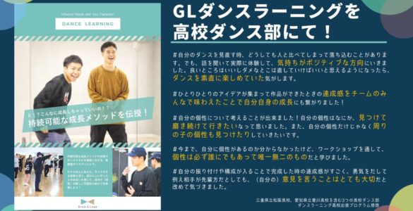 Grow & Leapブログ 【映像完成!】松阪高校ダンス部でのダンスラーニング! 先日、松阪高校にてGLダンスラーニングを実施させていただきました! そのダイジェスト映像が完成しました! 松阪高校ダンス部の皆さんが一人一人が意見を出し合い、それを1つの作品に仕上げていく過程を、そばで見ていましたが、この瞬間、このグループでしか生まれない「個性」の作品が誕生していました! 本当にびっくりです! ...