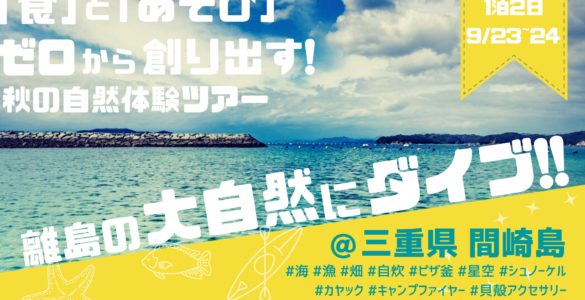 イベント情報 【9/23~24】秋の自然体験ツアー@三重県間崎島 \非日常!自分だけの自然体験ツアー/大自然にダイブツアー@三重県間崎島ー忙しい日常から一歩抜け出して自分と向き合う2日間ー 【9/23(祝金)~24(土)】に1泊2日の自然体験ツアーを開催します!...